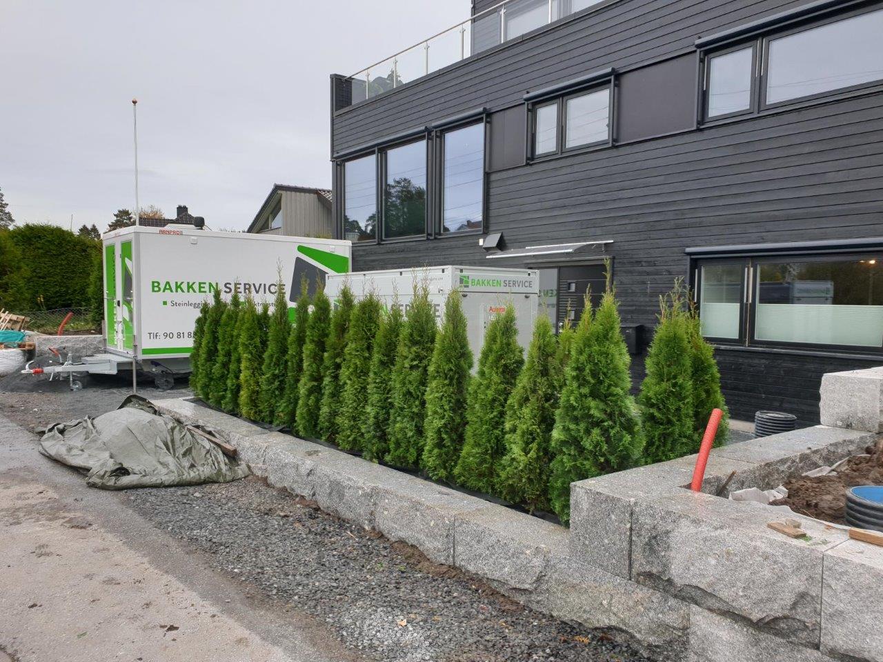Bakken Service drenerte tomtet, skiftet ut massen og kjørte inn ny kompostjord. Det ble plantet hekk og lagt ferdigplen, som gav tomten et grønt og friskt uttrykk igjen. Deretter la arbeiderne kantstein for å ramme hagen inne og dekorstein langsmed husveggen. Foran boligen fikk familien granittmuren de ønsket seg, med en granitt trapp, som fører opp til hagen. Oppkjørselen ble kledd med belegningsstein.